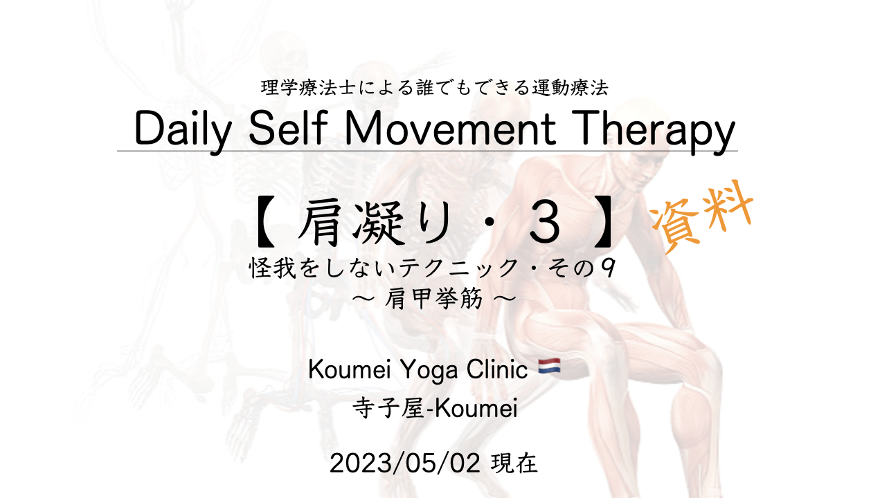 2023.05資料【 肩凝り3〜肩甲挙筋〜 】(2023.05.02現在)〜 怪我をしないテクニック その9/Daily Self Movement Therapy 〜 KYC 2023年5月2日 / 2025年5月13日 このコンテンツを閲覧するにはログインが必要です。 ログインはこちら. 新規会員登録はこちら Daily Self Movement Therapy 怪我をしないテクニック 肩凝り 肩甲挙筋 資料 運動療法