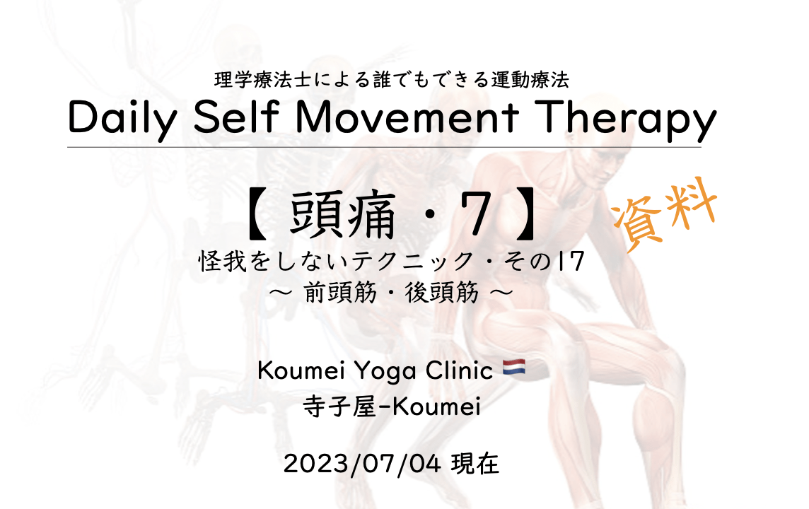 2023.07資料【 頭痛7 〜 前頭筋・後頭筋 〜 】(2023.07.04現在)〜怪我をしないテックニック その17 / Daily Self Movement Therapy〜 KYC 2023年7月4日 2025.05.13 このコンテンツを閲覧するにはログインが必要です。 ログインはこちら. 新規会員登録はこちら Daily Self Movement Therapy 怪我をしないテクニック 資料 運動療法