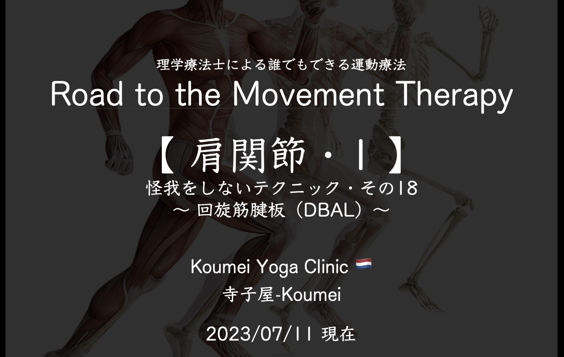 2023.07【 肩関節1 〜 回旋筋腱板(DBAL) 〜 】(2023.07.11現在)〜 Road to the Movement Therapy-18 / 誰でもできる運動療法の解説 〜 KYC 2023年7月11日 2025.05.02 このコンテンツを閲覧するにはログインが必要です。 ログインはこちら. 新規会員登録はこちら DBAL Road to the Movement Therapy ローテータ・カフ 予防体操 回旋筋腱板 筋膜 肩関節 誰でもできる運動療法の解説 運動療法