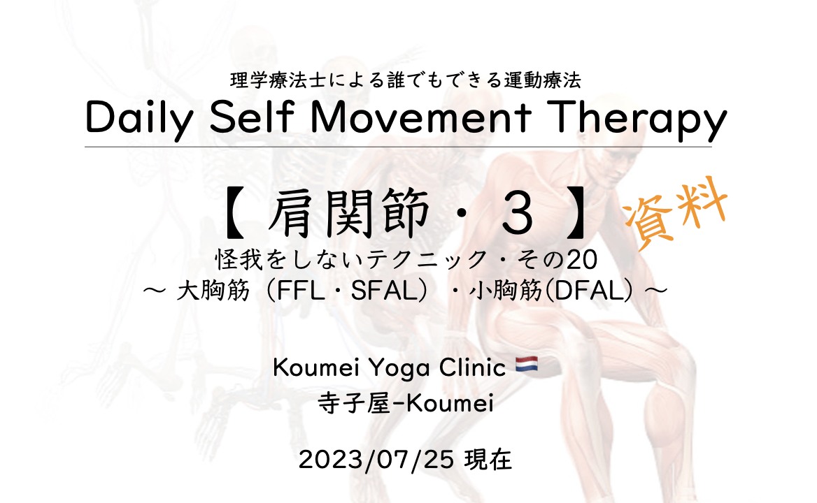 2023.07資料【 肩関節3 〜 大胸筋(FFL・SFAL)・小胸筋(DFAL) 〜 】(2023.07.25現在)〜 怪我をしないテクニック その20/ Daily Self Movement Therapy〜 KYC 2023年7月25日 / 2025年5月13日 このコンテンツを閲覧するにはログインが必要です。 ログインはこちら. 新規会員登録はこちら Daily Self Movement Therapy 大胸筋 小胸筋 怪我をしないテクニック 肩関節 資料 運動療法