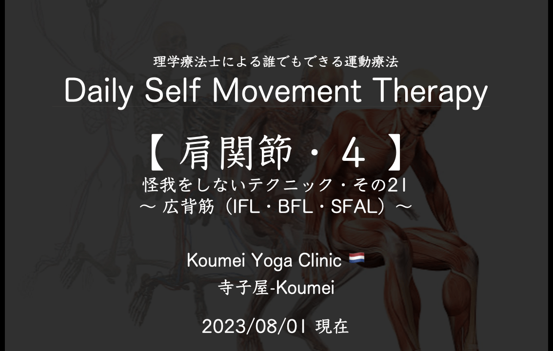 2023.08【 肩関節4 〜 広背筋(IFL・BFL・SFAL)〜 】(2023.08.01現在)〜 怪我をしないテクニック その21 / Daily Self Movement Therapy 〜 KYC 2023年8月1日 / 2025年4月2日 このコンテンツを閲覧するにはログインが必要です。 ログインはこちら. 新規会員登録はこちら Daily Self Movement Therapy テクニック 予防運動 五十肩 四十肩 広背筋 怪我をさせない 怪我をしない 理学療法士による運動療法というレッスン 肩 運動療法 運動療法というレッスン 頭痛