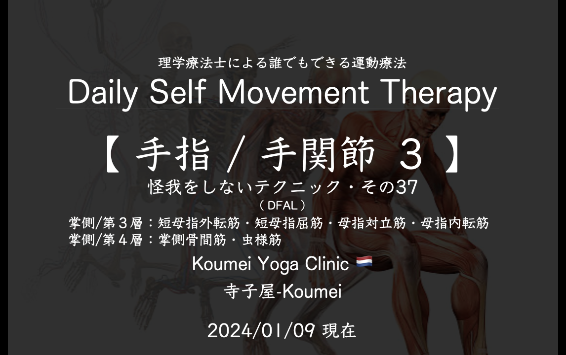 2024.01【 手指/手関節3 〜 DFAL 〜 】(202344.01.09現在)〜 怪我をしないテクニック その37 / Daily Self Movement Therapy 〜 KYC 2024年1月9日 / 2025年3月19日 このコンテンツを閲覧するにはログインが必要です。 ログインはこちら. 新規会員登録はこちら Daily Self Movement Therapy DFAL テクニック 予防運動 怪我をさせない 怪我をしない 手指 手関節 母指内転筋 母指対立筋 理学療法士による運動療法というレッスン 短母指外転筋 短母指屈筋 筋肉 筋膜 腱鞘炎 虫様筋 運動療法 運動療法というレッスン