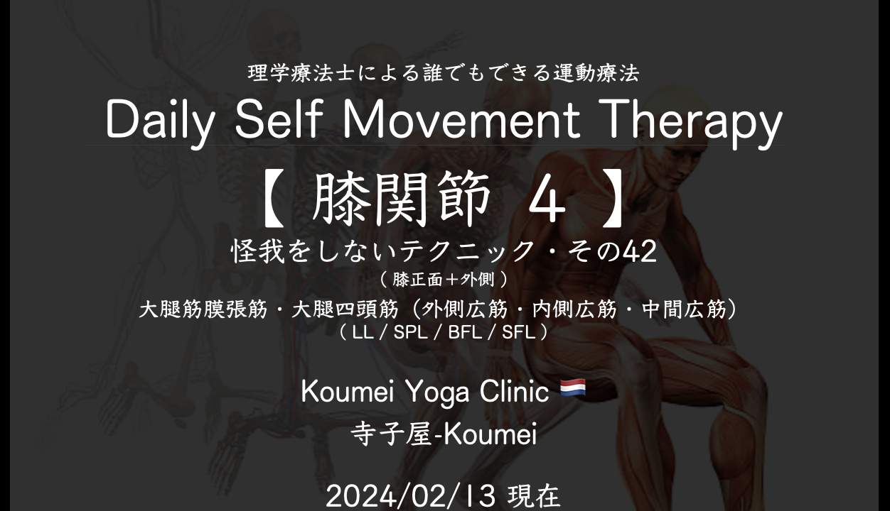 Daily Self Movement Therapy(理学療法士による運動療法というヨガの教科書3)【 膝関節4 〜 膝外側の筋群 〜 】(2024.02.13現在)〜 怪我をしないテクニック その42 /Daily Self Movement Therapy 〜 KYC 2024年2月13日 2025.03.19 このコンテンツを閲覧するにはログインが必要です。 ログインはこちら. 新規会員登録はこちら Daily Self Movement Therapy テクニック 予防運動 内側側副靱帯 変形性膝関節症 怪我をさせない 怪我をしない 理学療法士による運動療法というレッスン 膝関節 運動療法 運動療法というレッスン