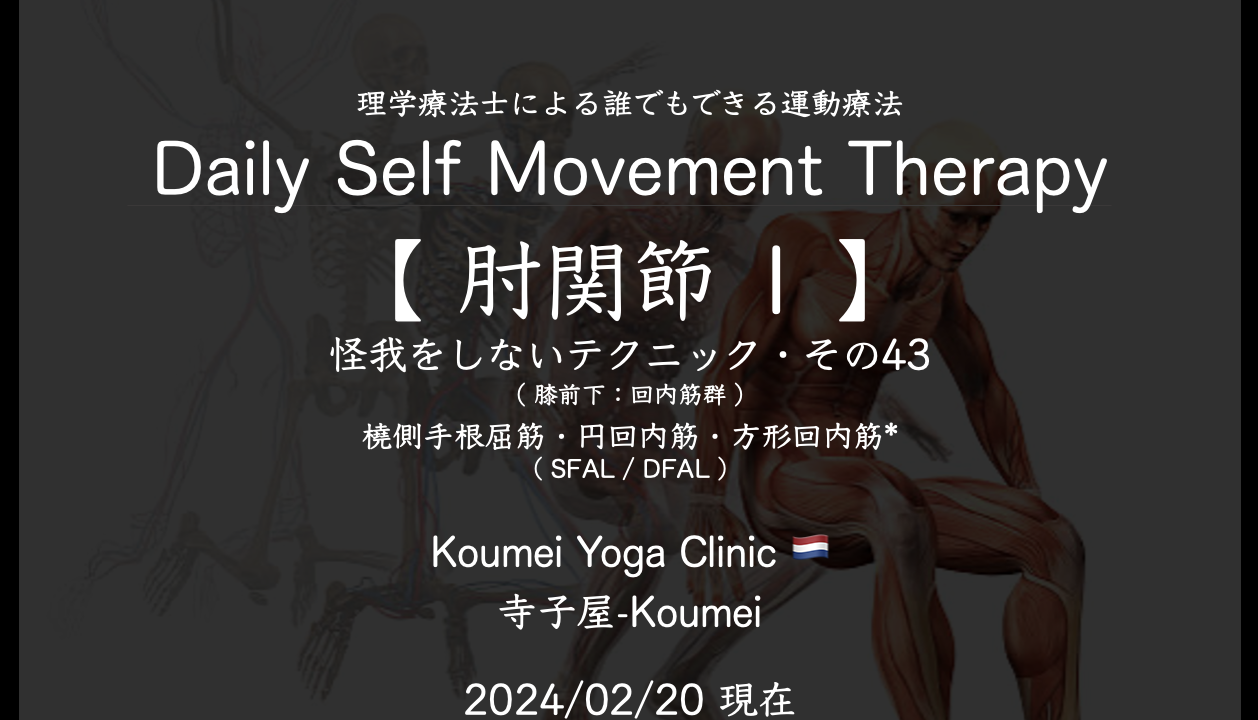 Daily Self Movement Therapy(理学療法士による運動療法というヨガの教科書3)【 肘関節1〜 回内筋群 〜 】(2024.02.20現在)〜 怪我をしないテクニック その43 /Daily Self Movement Therapy 〜 KYC 2024年2月20日 / 2025年3月19日 このコンテンツを閲覧するにはログインが必要です。 ログインはこちら. 新規会員登録はこちら Daily Self Movement Therapy テクニック 予防運動 怪我をさせない 怪我をしない 理学療法士による運動療法というレッスン 肘関節 運動療法 運動療法というレッスン