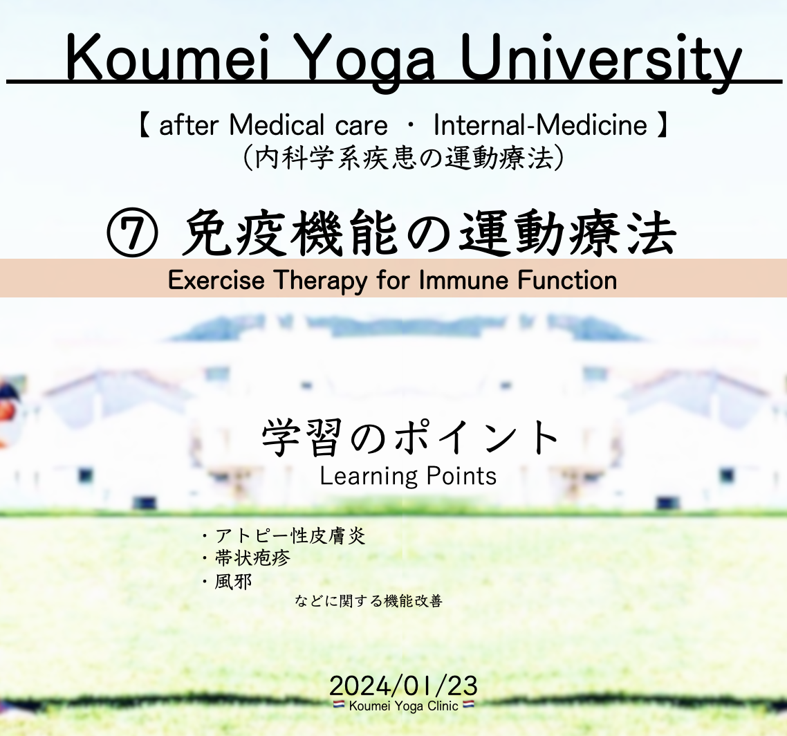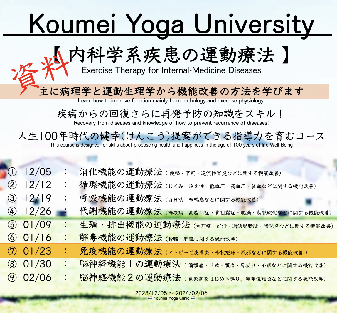 【 内科⑦・免疫機能の運動療法・KYC-1500 】学習動画一覧 KYC ( 免疫力低下に関する諸症状の機能改善 )講座アーカイブ※POPをクリックすると動画や資料のサイトが出てきます(49:32)事前学習アーカイブFrom 【 Yes, Koumei!】・From 【 Terakoya-Koumei 】・From 【 Koumei Yoga University 】・Koumei Yoga Clinic へのご質問・お問い合わせは、下記フォームよりお送り下さい。(必須)お名前(必須)メールアドレス(必須)お問い合わせ内容をご記入ください。スパムメール防止のため、こちらのチェックボックスにチェックを入れてから送信してください。